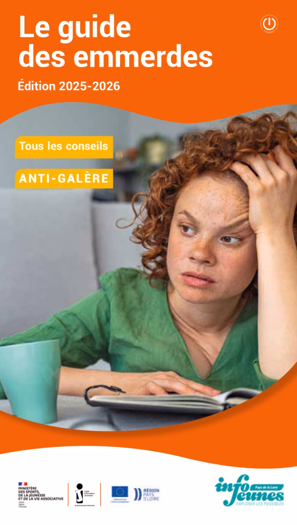 Guide à retrouver gratuitement en version papier dans toutes les structures du réseau Info Jeunes en Pays de la Loire ou en version numérique : guide des emmerdes 2025-2026.